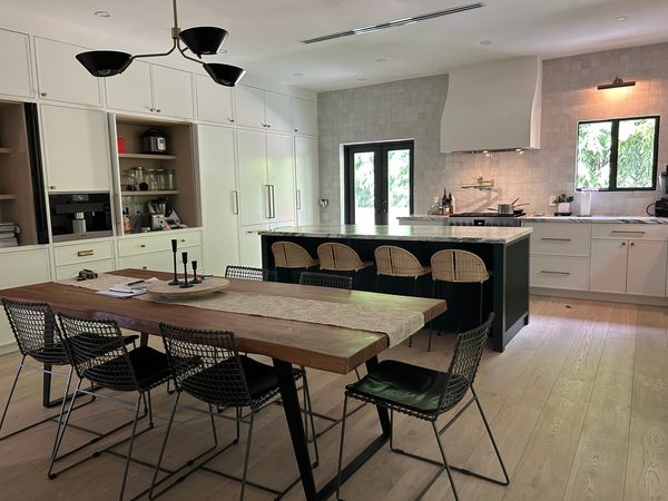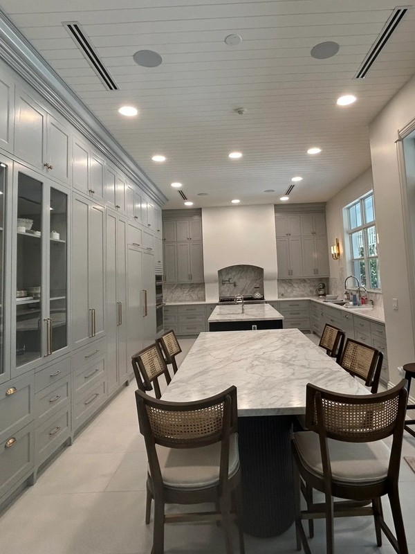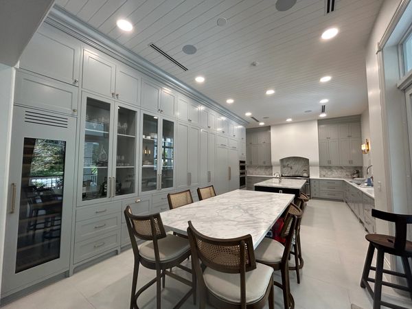 This fully custom kitchen was designed and crafted with precision, featuring bespoke cabinetry finished with a custom paint treatment. The island showcases a fluted veneer front paired with a quartz waterfall countertop, creating a refined focal point within the space.